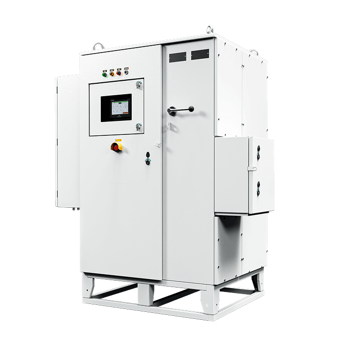 The power compartment uses an isolated air-to-air heat exchanger. This keeps the dirty external air (sand, salt, dust) away from the sensitive filter components and drive electronics, ensuring longevity in harsh environments.